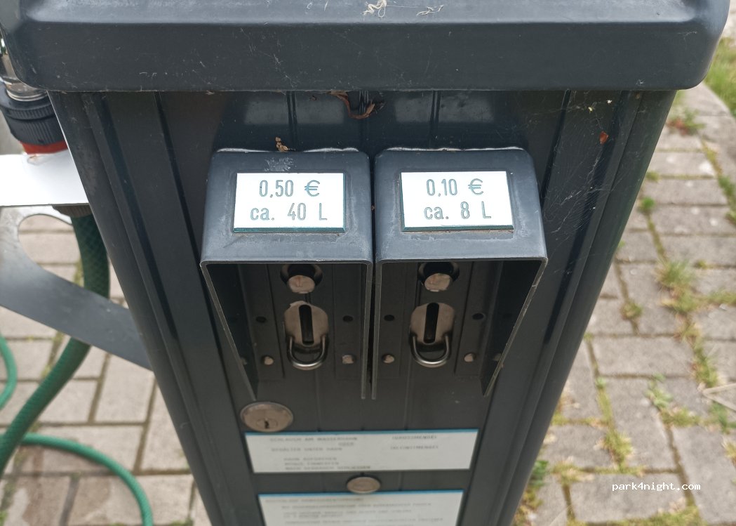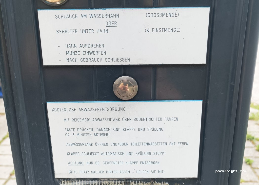 we park in the proper camper space 5 euro for 24h waste disposal free nice toilet block a short walk away, open until 8pm-ish a stork hangs out on a nearby sign which the children love there is an excersize park at the bottom of the hill