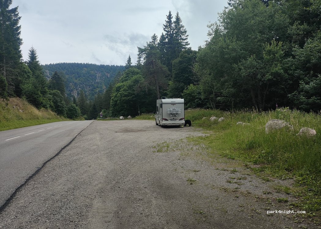 Grosszügiger Holzplatz an der Strasse, leicht geneigt, windgeschützt im Tal, nachts völlig ruhig, Handy-Empfang stark eingeschränkt.