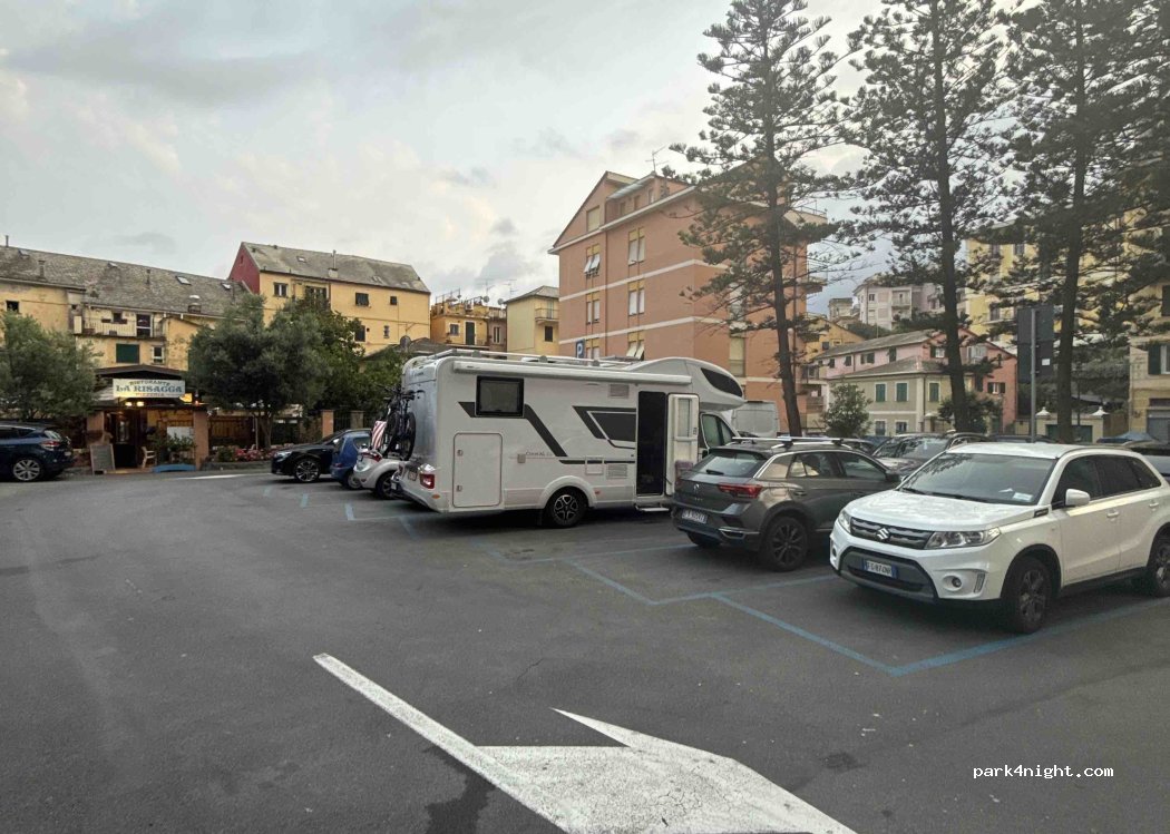 Petit parking jour et nuit payant à moins de 5 minutes de la plage. Pas de vidange, ni eau, ni électricité. Pas toujours de la place. Sous le pont ferroviaire de Bogliasco. Un peu de bruit la nuit dû à la proximité de l’Area Pedonale qui mène à la plage et qui récupère les rentrées de soirées sur le sable. Beaucoup de choses à proximité, boulangerie, glaces, restaurant, magasins, céramiques … toilettes dispo sous le restaurant du club nautique en direction du port. Au top pour une nuit avec deux enfants 3 et 7 ans