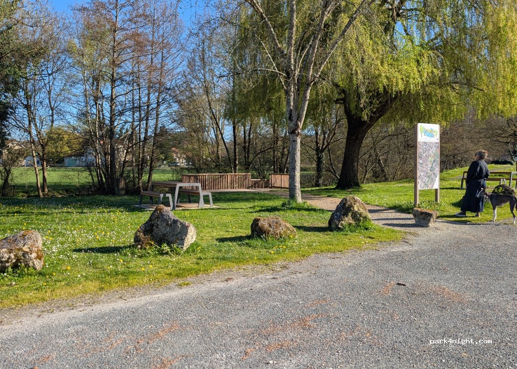 Parking partagé avec les voitures Aire de vidanges pas pratique Services payants WC public occupé par un SDF Site agréable entretenu et calme la nuit le long d'un espace vert et arboré avec tables de pique-nique avec poubelles et d'une belle petite rivière Commerces à proximité, boulangerie ouverte le matin pharmacie pizzas à emporter banques super u