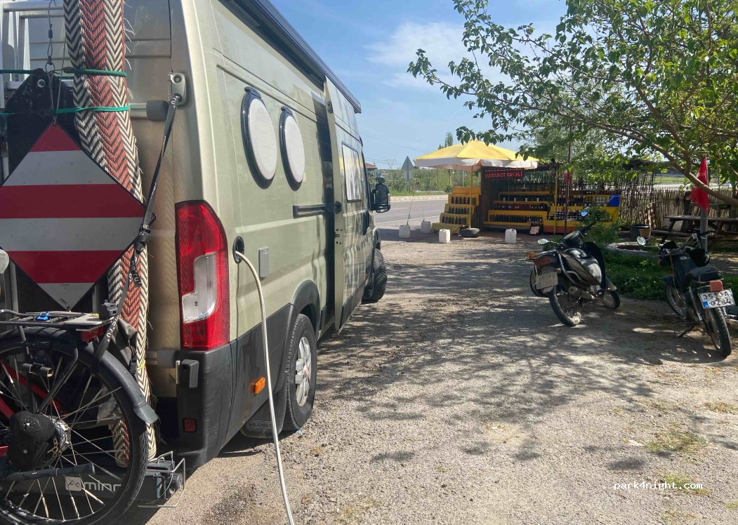 Gut signalisiert, gute Zu- und Wegfahrt. Sobald man mit dem Camper hinfährt, kommt er mit dem Wasserschlauch. Er verkauft leckere Spezialitäten wie Maulbeer Sirup, oder karamellisierten Johannisbrot-Sirup. Auch gezuckerte Früchte Konfitüren können gekauft werden.