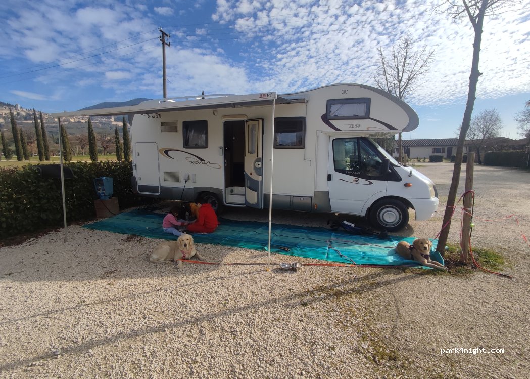 Alle pendici del colle su cui sorge la bella città di Assisi, l'area di sosta offre una magnifica vista giorno e notte. Puoi camminare in città in 10-15 minuti. Il proprietario è molto gentile e l'accesso è disponibile 24/24h. C'è luce, acqua potabile, lavabo esterno solo con acqua fredda e scarico anche per i servizi igienici nautici, ma il passo d'uomo è veramente piccolo. Quello per cui si paga è la vista, bellissima e la posizione, molto comoda. Prenotazioni solo il giorno dell’arrivo, telefonicamente. Nessuna prenotazione nei ponti e festività.