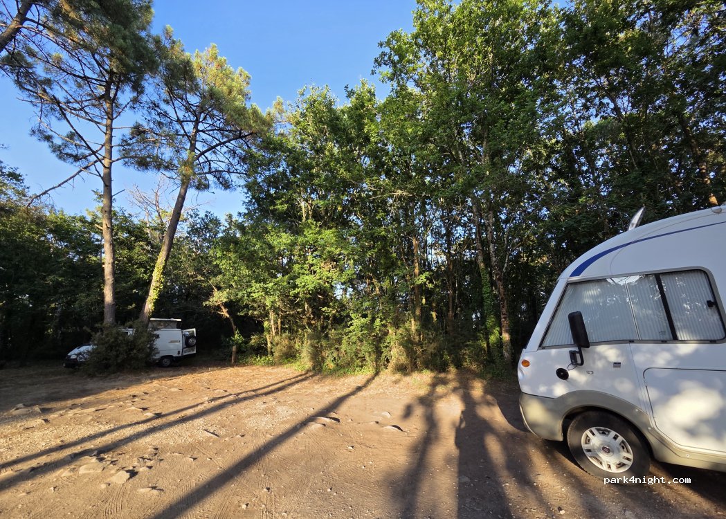 Parking not indicated but frequented by locals. Under the pines, shaded, 2 picnic tables, about 10 parking spaces possible. Access GR and pebble beach by a pretty path under the pines! No ban for a night camp.