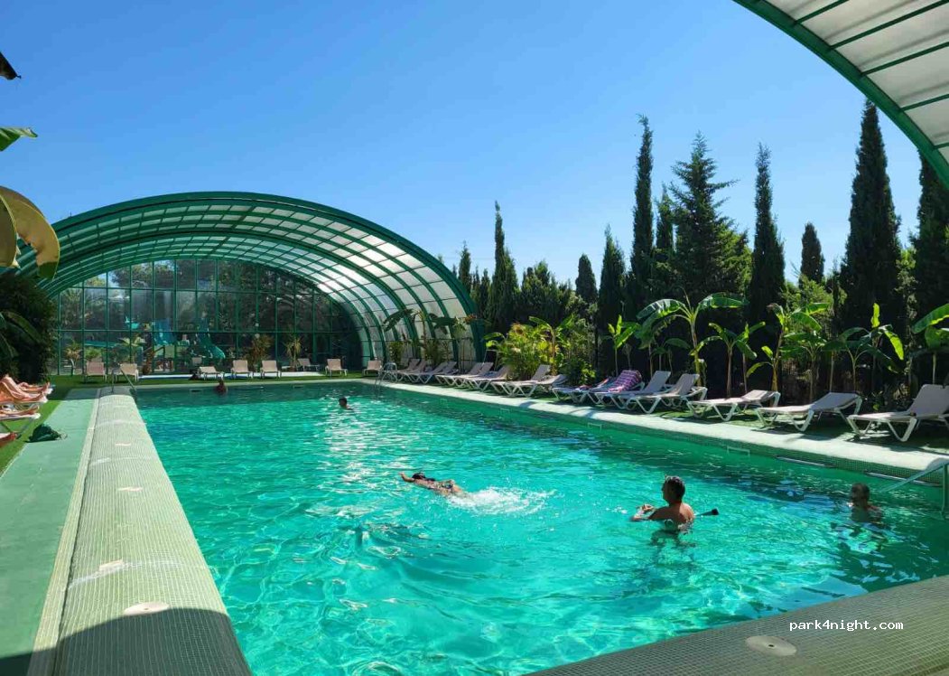 Nous avons passé 2 nuit en camping-car dans ce camping fin avril. 101€ pour 2 adultes + 2 ados et 1 chien avec carte asci. (Chien accepté uniquement en hors saison) Le personnel parle français, la plage est juste à côté, les emplacements et les sanitaires sont super, les piscines et jaccuzi top aussi. Tout est très propre, de superbes aires de jeux pour les enfants, une grande épicerie et une boutique avec des prix corrects, plusieurs bars et restaurants. Bref camping vraiment très bien équipé un mini golf gratuit, 1 petit cadeau à notre départ. Par contre n’hésitez pas à insister pour que l’on vous ouvre le portail du second accès, car l’accès principal se fait par un tunnel étroit, nos rétroviseurs qui ne se plient pas ont frotté en rentrant, du coup nous avons demandé de sortir par l’autre accès et là aucun soucis. Ensuite si vous êtes à pied il n’y pas grand chose à faire autour, et pas de piste cyclable sécurisée c’est dommage. Et à notre goût un peu trop de règles: chien accepté seulement sur quelques parcelles (ça ok je comprends) mais lorsque vous souhaitez promener votre chien c’est pareil attention il est interdit à de nombreux endroits du camping même de simplement traverser une zone d’emplacement pour sortir du camping, bref ça j’ai eu du mal à comprendre en quoi juste traverser avec un chien en laisse déranger, et pour les jacuzzi c’est pareil il y’a des horaires 11h 13h et 17h 19h même pour celui en plein air. Donc voilà nous ne sommes pas restés plus longtemps et avons préféré trouver un camping avec plus de balades à faire et moins de règles. Et sans train qui nous réveille chaque matin en klaxonnant