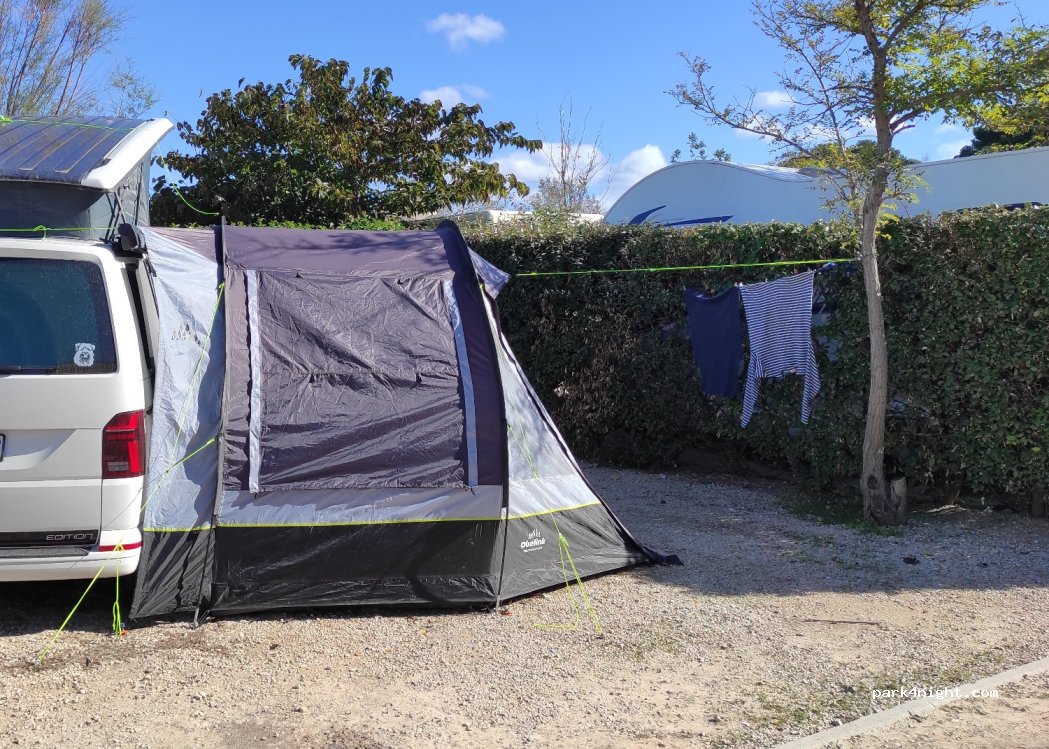 Ein parzellierter Schotterplatz mit sauberen Sanitäranlagen. Die oberen Stellplätze sind etwas abschüssig (Ausgleichskeile), die unteren sind eben, liegen aber näher an der Straße, die am Platz vorbei führt. Sehr freundlicher Empfang. Baguettes können in der Nebensaison im Restaurant vorbestellt werden. Der Weg zum Strand ist ein Katzensprung. Leider sind am Strand ganzjährig Hunde verboten.