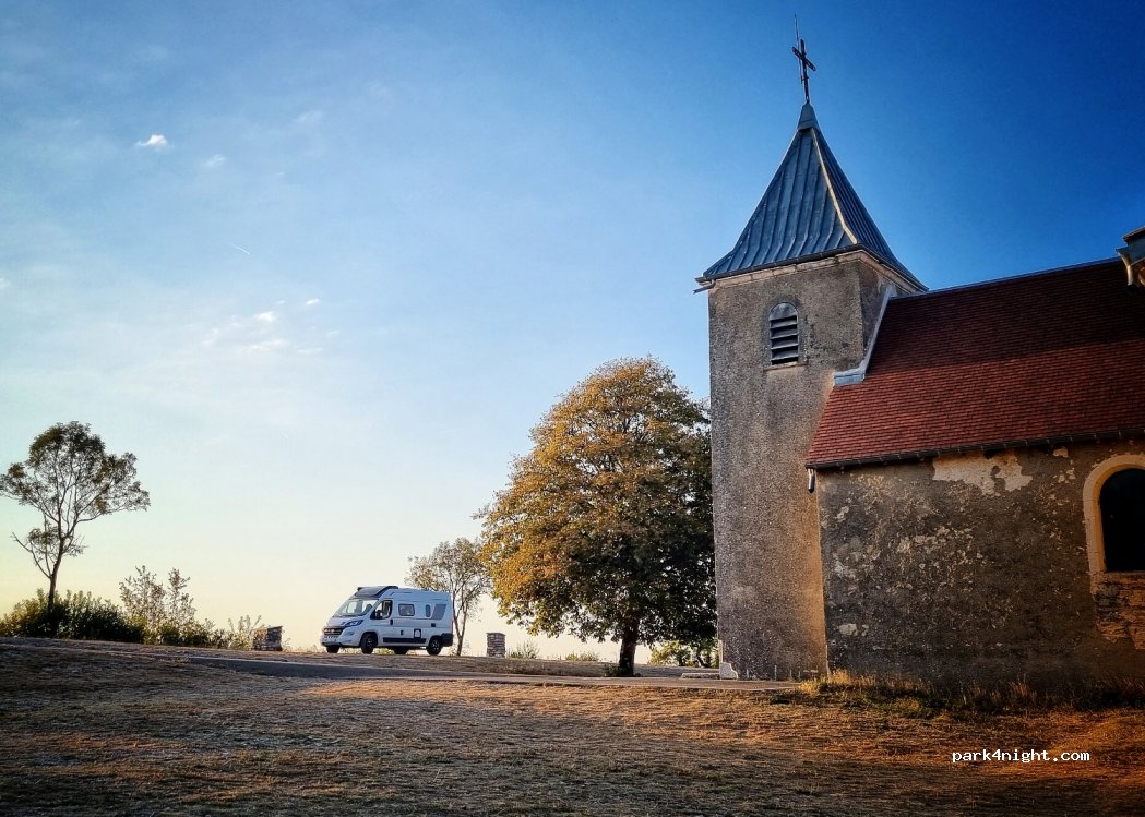 Un lieu magnifique et très calme, une vue splendide, beaucoup de place, idéal ! Quelques jeunes sont venus faire un barbecue, mais très polis et peu bruyants, ils n’ont pas du tout été gênants durant la nuit. Messe dans l’église les jours d’office (= circulation). La route d’accès est très étroite (un seul véhicule à la fois), mais plutôt praticable. Excellent lieu d’étape !!