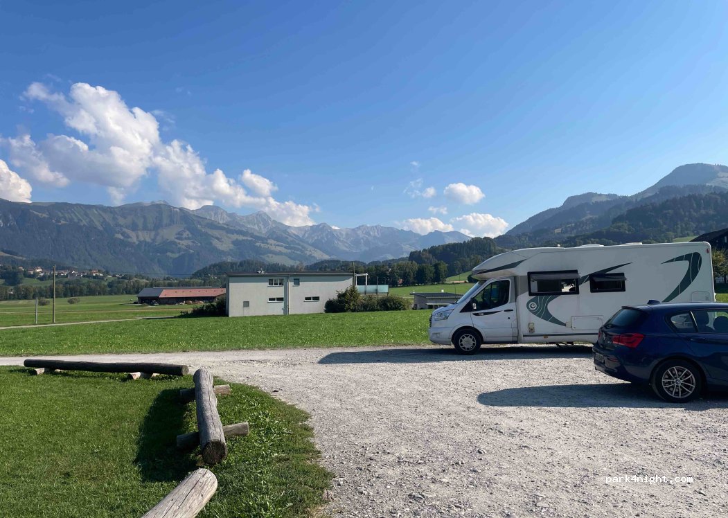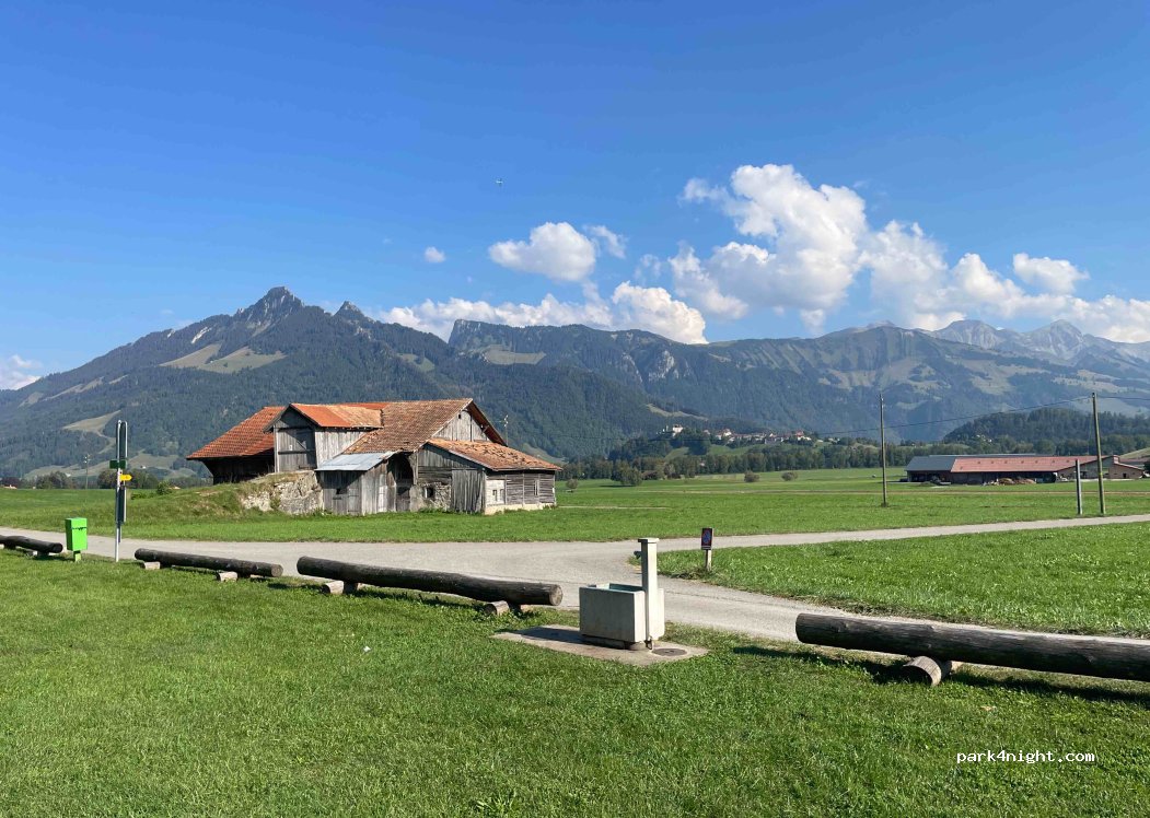 Nice free little place on a playground, clean toilets , water , picnic table , nice view on the mountains - 1min walk to the train station that takes you to gruyère in 3 mins ( for 5francs ) -