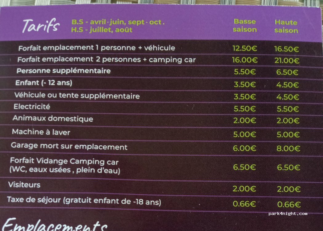 Y avons passé 2 nuits du 27/04 au 29/04 à 10,40 € par jour pour fourgon avec 2 personnes. Camping sympa bien tenu avec petite bibliothèque multi-lingue à disposition fauteuils et même bouilloire avec thé ou autre à disposition. Merci à la commune avec un petit bémol pour le prix de l'électricité bien cher pour alimenter notre tout petit réfrigérateur (avons donc écourté notre séjour sur Vinsobres)
