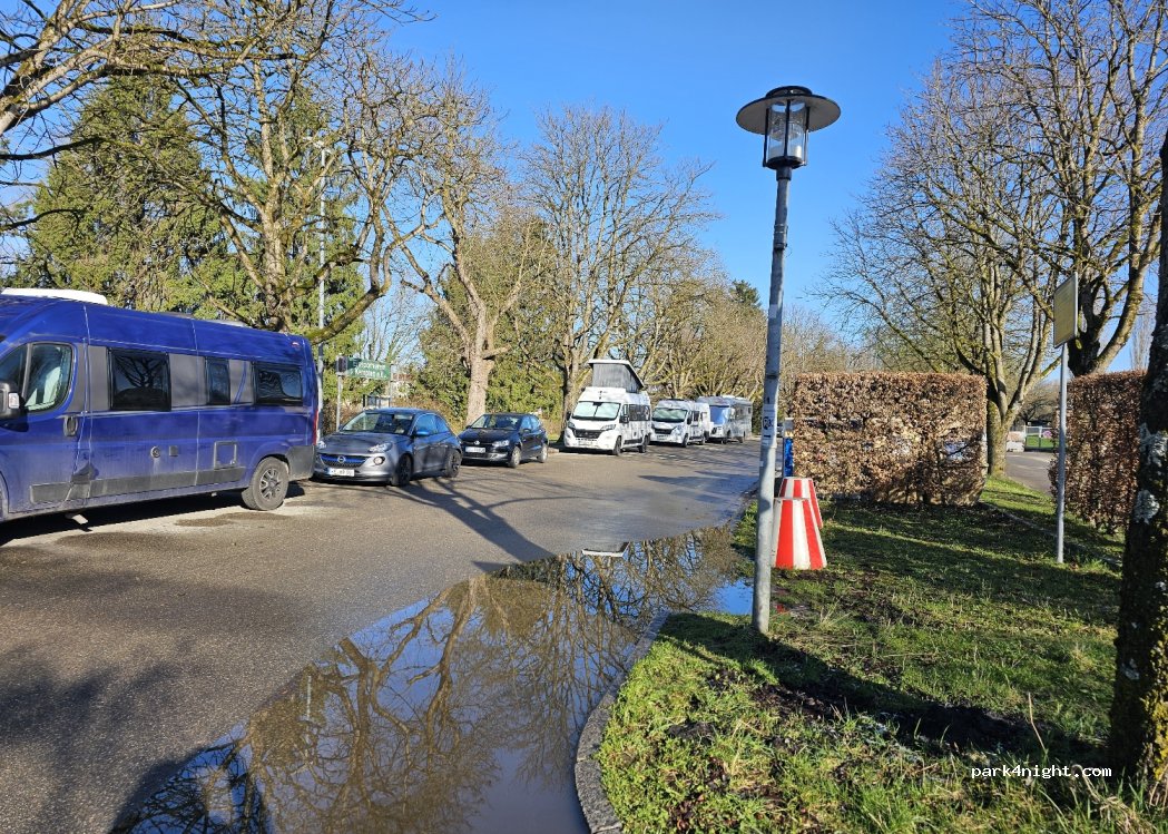 Gut wenn der WoMo Parkplatz wieder mal durch Dauercamper ab 15 Uhr voll ist. Durchreisende stellen sich besser gleich an die Straße. 4€/24h. Keine Verbots/Autoschilder. Auch einige Anlieger haben ihren Camper hier geparkt. War sehr ruhig und relativ eben. Bei Regen Tropfen durch die Bäume