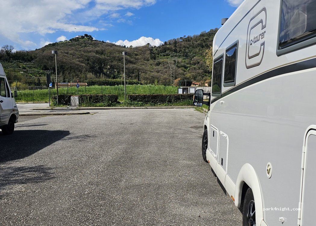 Flat, level ground, nice views of hills which you can walk up from the car park, a castle is on one hilltop. Great signal and bakery about 8 minute walk up the road. Toilet waste was overflowing and some vans seem to be there permanently as storage from local Italians. we got lucky with a space.