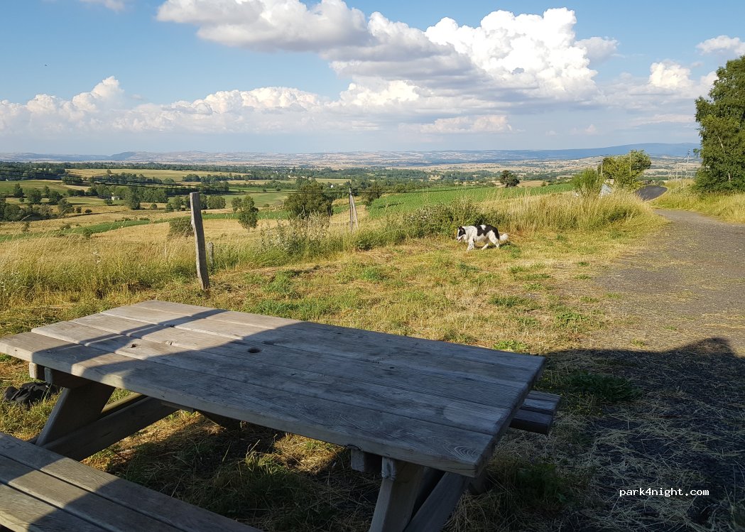 Spot beaucoup plus facile d'accès avec un panorama sur le Plomb du Cantal plus impressionnant que le site plus haut avec la table d'orientation. Être camping-cariste, ce n'est pas que la chaise longue et la pétanque, mais aussi le VTT ou la rando Si des automobilistes pratiquent ces activités, je me sens nullement gêné. Pour les nuits un peu fraîche, une couverture polaire en plus fait l'affaire