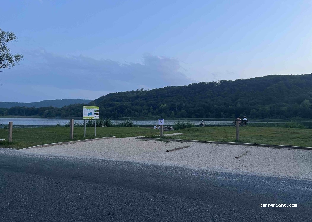Nous y avons été et c’était splendide ! Nous étions les seuls. Un peu de passage jusqu’à la tombée de la nuit mais ensuite très calme. Jolie vue sur le lac ! Pas de problème d’accès, de hauteur ni de longueur. Attention aucun services autour !