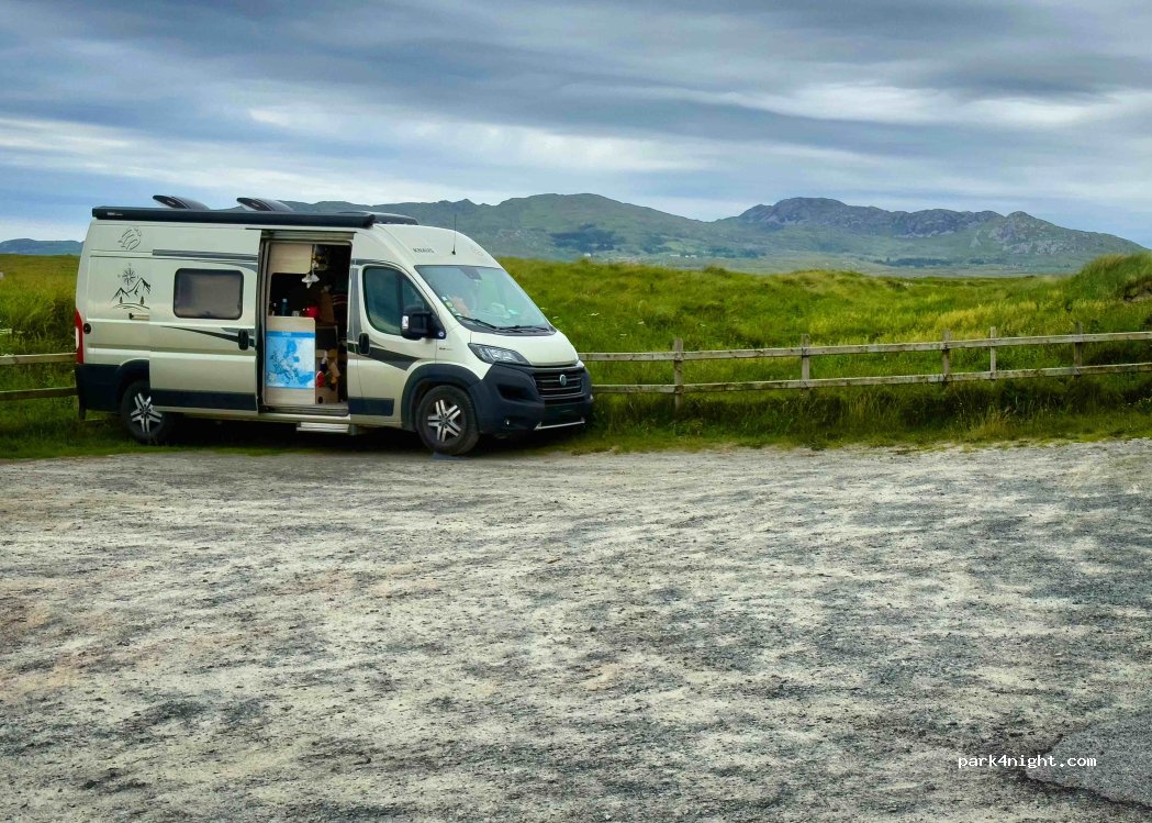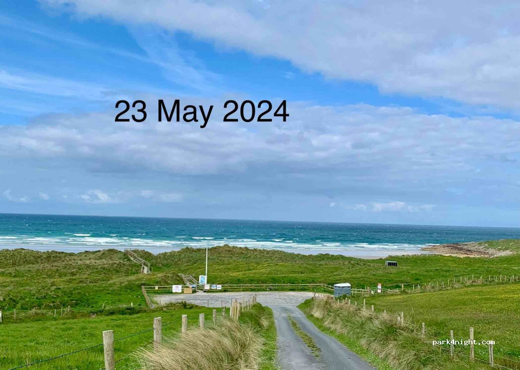 Dooey beach. Crazy roads leading to it, narrow and badly need repair. A bit of a drive but worth it. Space enough for at least 10 cars. I counted. Stayed in my car with another 5-6 camper vans. No signs for “no overnight parking”. Phone signal patchy. Nice swimming area, popular with surfers.