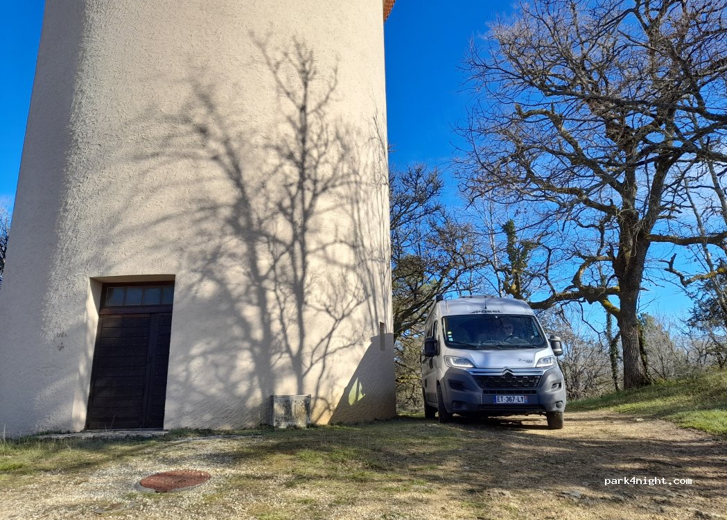 Jolie vue et nuit calme. Malheureusement la pluie et l’orage se sont invités à la fête mais l’endroit reste excellent. Face à la vue à gauche du Château d’Eau et sous les arbres c’est suffisamment grand et plat pour un van.
