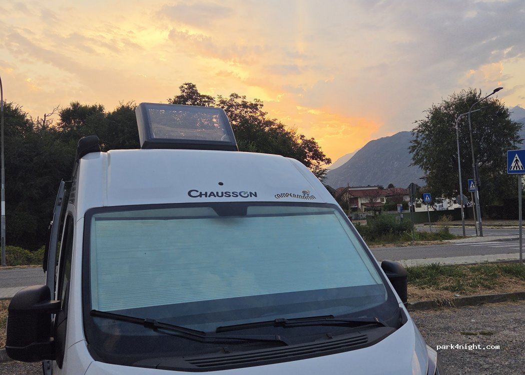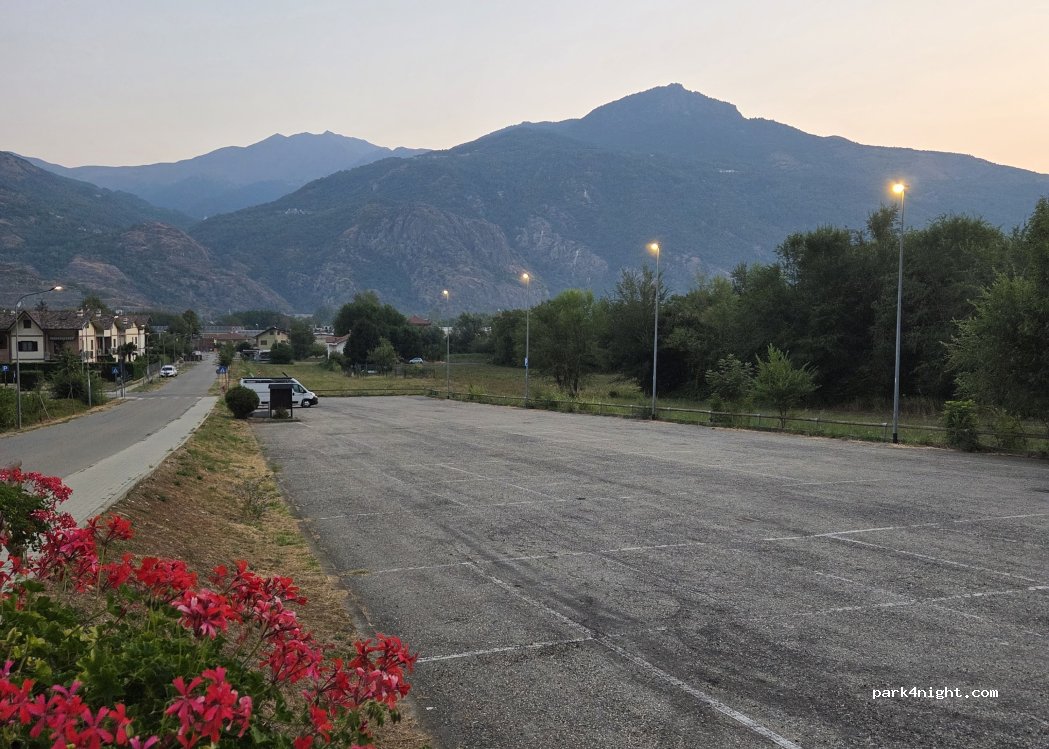Très grand parking plat, au départ du sentier muletier pour monter à la Sacra San Michele. Petit village tranquille où les locaux se promènent avec leur chien le soir. Nous avons vu le troupeau de vaches rentrer au bercail :-). Très belle vue. Pas d'eau ni poubelles.