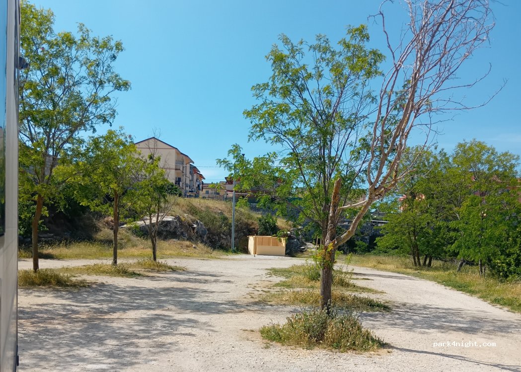 Parking en terre battue sans installations à côté d'une pizzeria et d'un beau jardin public avec sanitaires ouverts en journée