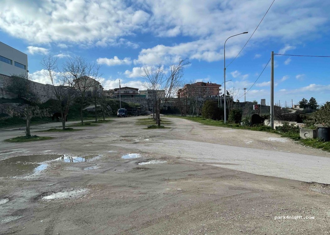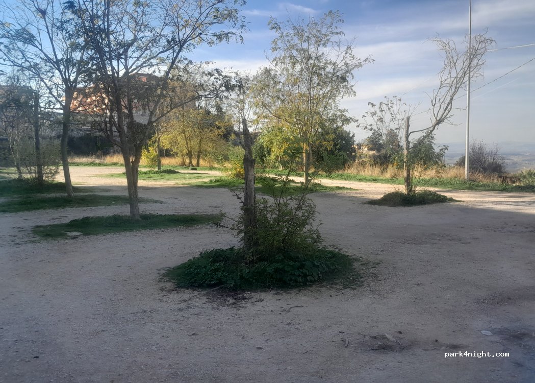 Parcheggio sterrato senza servizi accanto a una pizzeria e a un bel giardino pubblico con bagni aperti durante il giorno