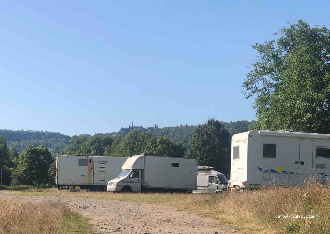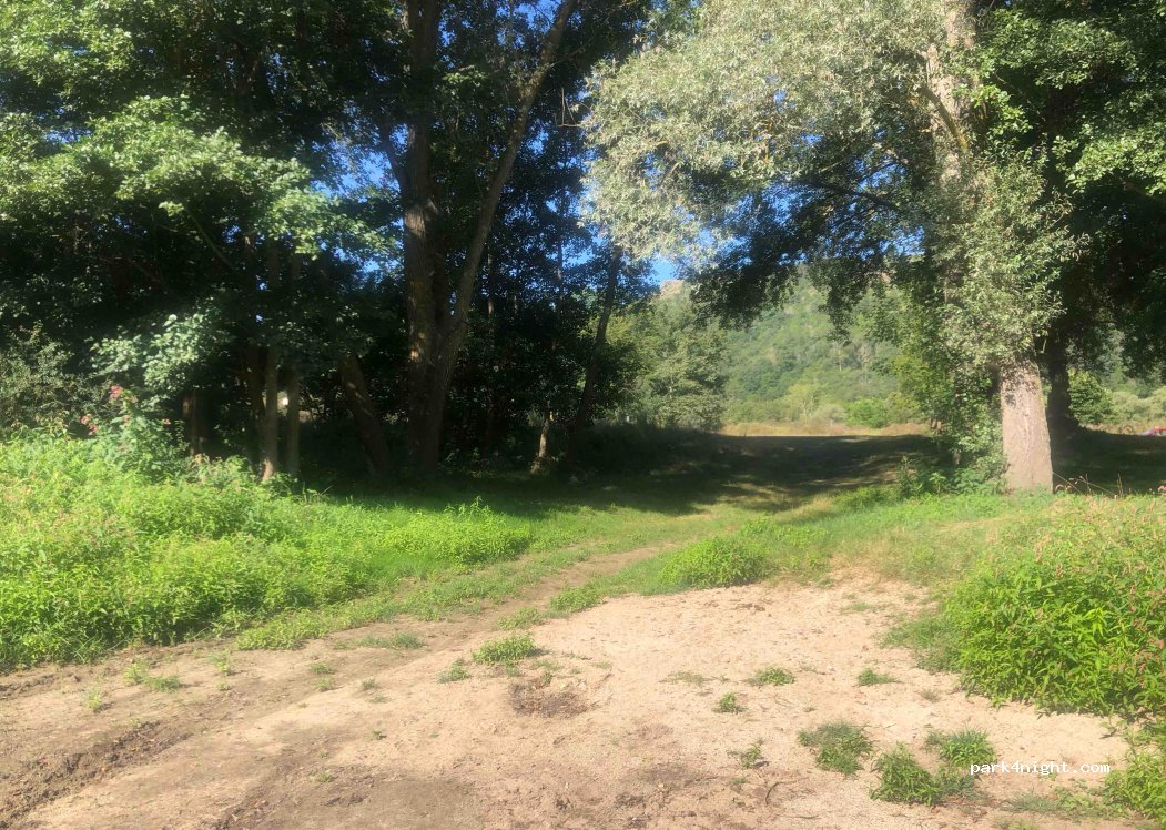 Parfait ! Une grande étendue d'herbe avec largement de la place pour plusieurs véhicules sans être trop serré. Accès direct à la rivière et plaque de béton aménagée et poubelles disponibles. Nous sommes restés deux nuits et une journée entière sans problèmes, très calme, seulement le passage de promeneurs de chien.