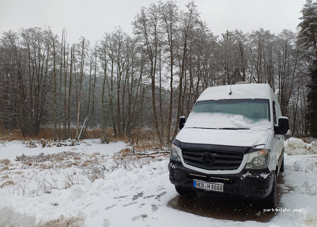 Der Parkplatz für ca. 10 Fahrzeuge ist leicht geneigt. Haben allein eine sehr ruhige Nacht gehabt. Wohnhaus gegenüber der Kapelle, die um 20Uhr und um 5.30Uhr bimmelt. Um 6.45Uhr für eine halbe Stunde lautes Gekläffe und Gejaule von einem Rudel Schlittenhunde, die dann zur Trainingsfahrt aufbrachen. Problemloser Empfang für O2