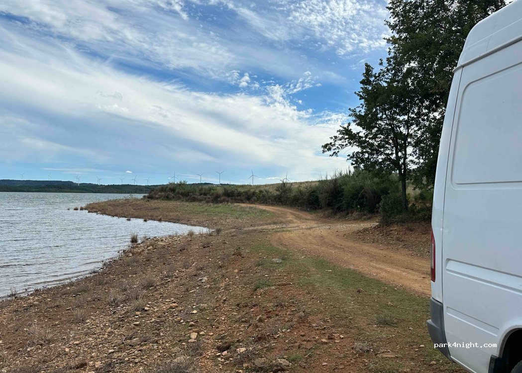 Wonderful place by the lake, parking possible, many straight areas and space for some campers, no drops, some locals enjoy their free time here. When we arrived there were already two small camper vans. Very idyllic view of the reservoir. The driveway is a little bumpy, but no problem with our 2006 MC Sprinter. It's possible without 4X4! I wish you a happy stay. Take away all trash, including used toilet paper!