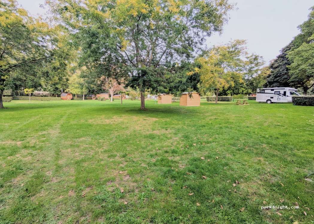 Wonderful site. Grassy, shade, lots of space. WC and shower block ok. Black and grey emptying. Fresh water. Phoned upon arrival at entrance car park, left message and someone called me back within a few minutes with code for barrier. Paid at mairie the following morning. €8.80 includes EHU. Highly recommended!