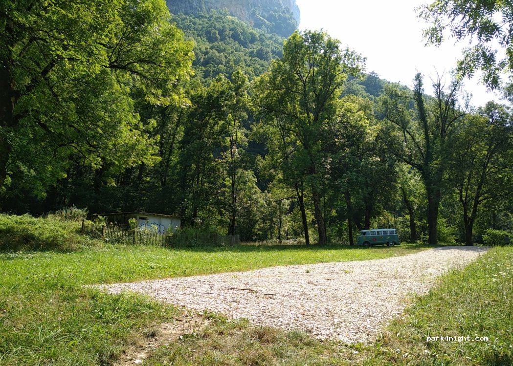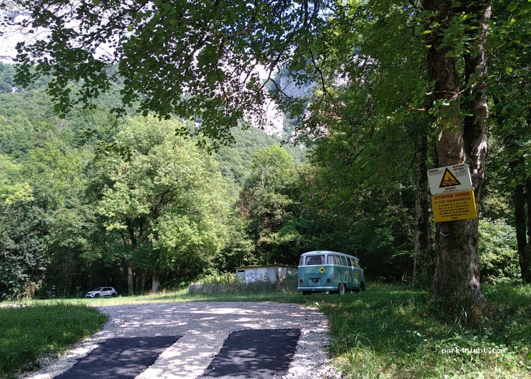 Flat and shaded parking, next to the dam of the Bournillon hydroelectric power station. Very quiet, possible to follow a path to go swimming in Bournillon (10 min walk)