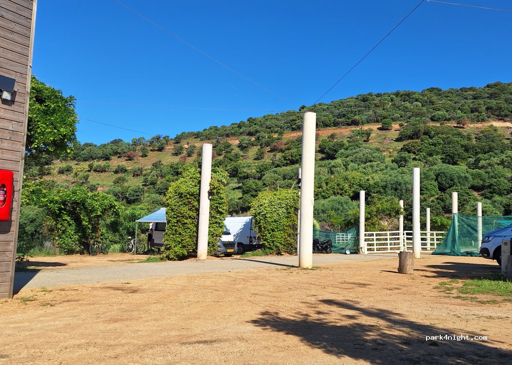 Camping très agréable au dessus de Cargese. Sanitaires neufs impeccables. Pour les vans préférer les places sous les arbres. Pain le matin, dîner possible en septembre.