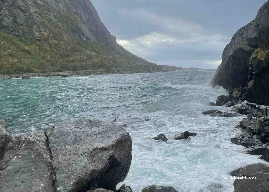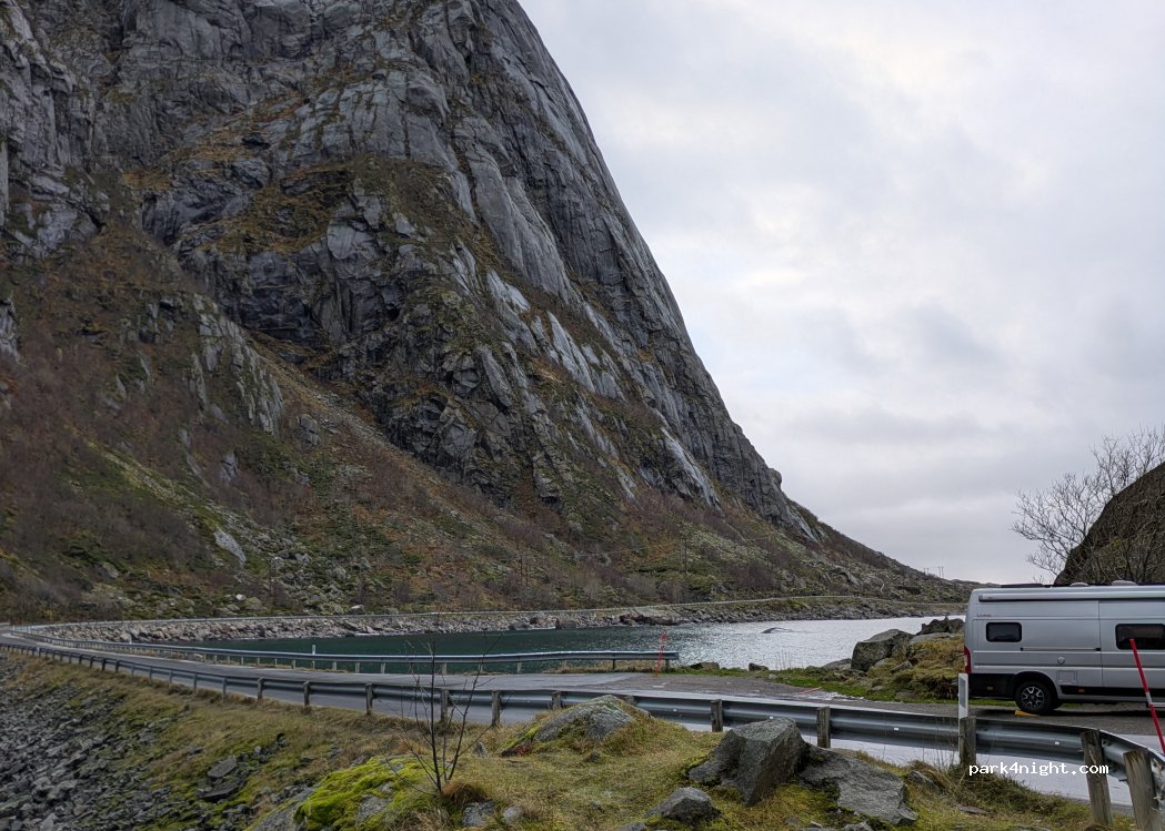 Parking lot on the road to Henningsvaer. You can park on the rocks, protected from the wind. You can see the spot from Trosketunga. Traffic is a bit loud, but it calms down overnight and starts again in the morning.