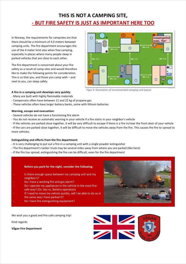 Die Feuerwehr empfiehlt, auch beim freien Campen den 4-Meter-Abstand einzuhalten, insbesondere an Orten, an denen viele Menschen in dicht beieinander geparkten Fahrzeugen übernachten.