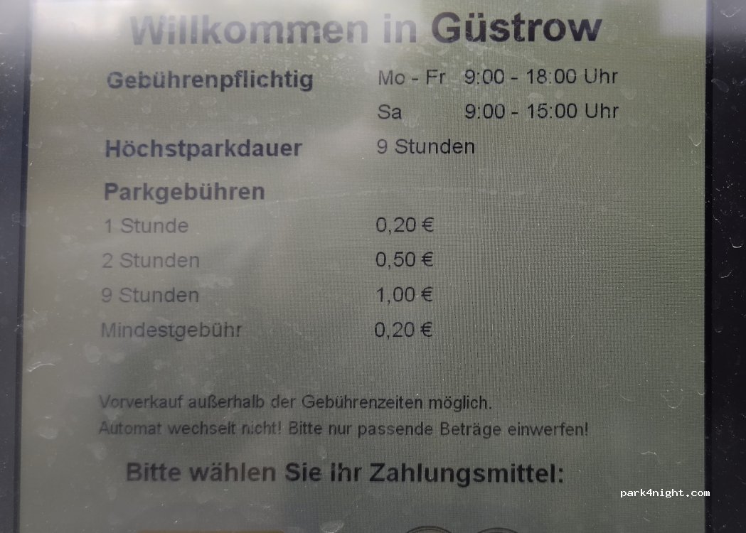 Wir waren Sonnabend/Sonntag auf diesem Stellplatz. Sonnabends ab 15 Uhr und sonntags fallen keine Gebühren an. Etwas irritierend ist der Hinweis an den Parkautomaten, dass die Höchstparkdauer 9 Stunden beträgt. Das gilt wahrscheinlich nur für Pkw. Wir hatten jedenfalls keine Schwierigkeiten. Ärgerlich sind die geschlossenen Toiletten. Nachts ist der Platz sehr ruhig. Güstrow ist eine schöne Stadt