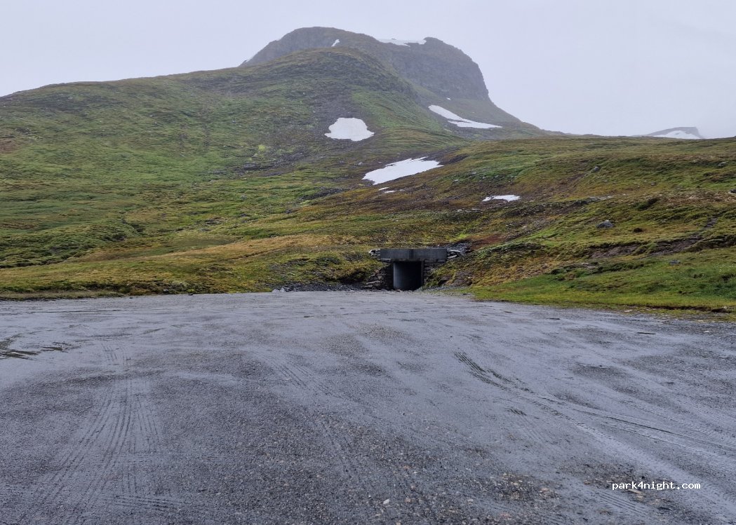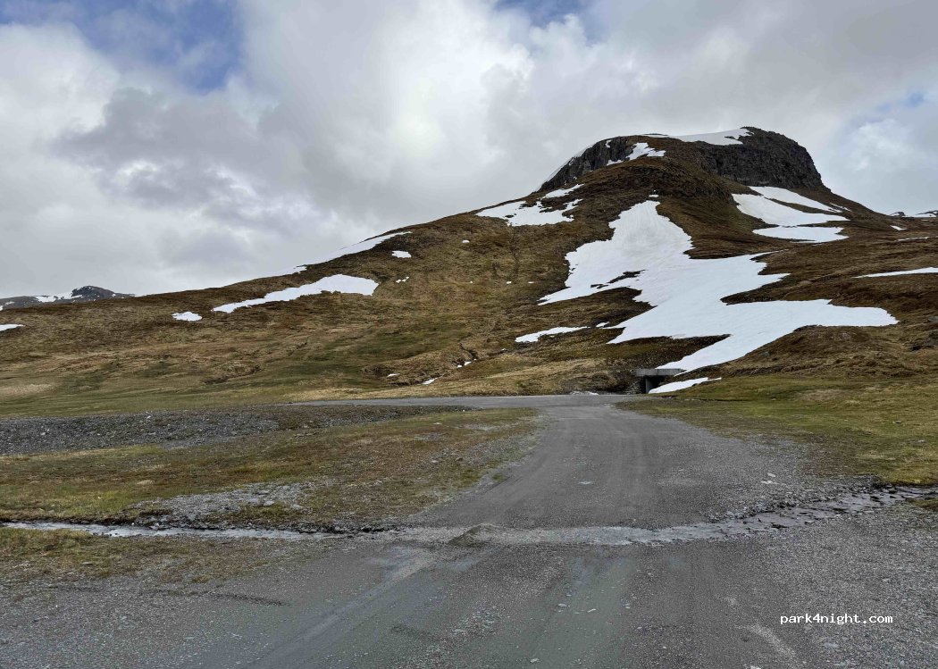 In begin juni nog volledig bedekt met sneeuw. Maar 100 meter verderop is een nieuwe grote gravel parkeerplaats met hetzelfde uitzicht.
