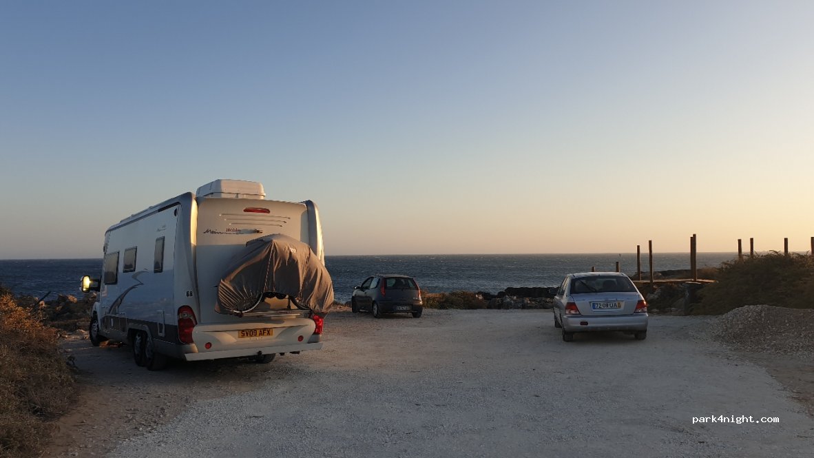 Parking for 4-5 campers maximum but sometimes there are cars. we managed to park our 8.5m camper here. it's a little windy, less than the rest of the road in this area. you can just see the sunset. there's a restaurant being built Currently next door. It's off the road and overlooking the rocks.