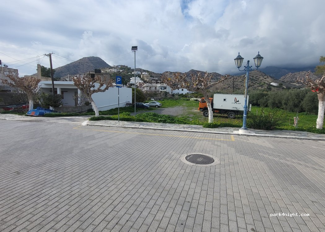 Sehr schönes kleines Touri- Dörfchen,Friseur,Fleischer,Bäcker,Market,Taverne. Viele Katzen aber der Platz ideal. Nachts ruhig und nach dem Starkregen/Gewitter morgens war das viele Wasser komplett versickert. Wir sind mehrere Nächte geblieben. Nur große Mülltonnen oben an der Straße. Wasser muss man sich am Hafen holen, direkt neben bzw. an der Tisch-Sitzbank Kombination.