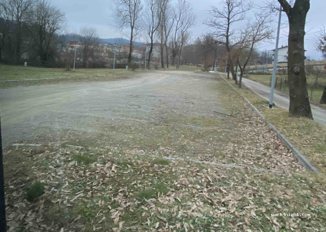 Parcheggio di ghiaia adiacente ad un parco giochi.