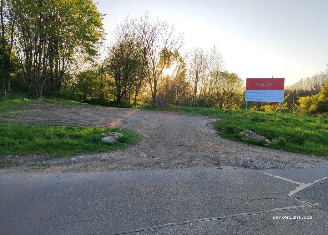 Kleiner unbefestigter Parkplatz an einer Nebenstraße. In der Nähe befindet sich ein kleiner Fluss. Etwa 500 Meter vom Parkplatz entfernt gibt es einen Lebensmittelladen.