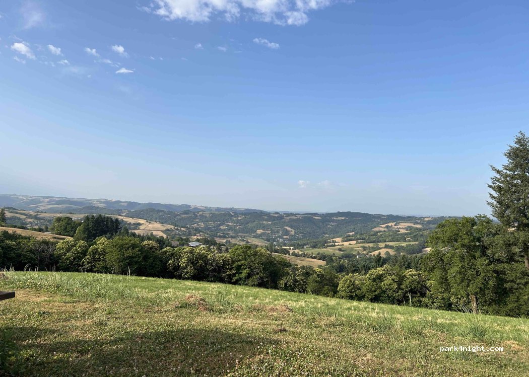 Panorama exceptionnel, nous sommes restés 2 nuit(16-17/08) visite de la ferme sympa, dommage qu'il n'y avait plus que des terrines en vente. avons profité d'une belle rando à pied grâce au proprio qui nous as fourni une carte et il nous a même conseillé sur la suite de nos visites ( bozouls : magnifique ! ) et conques que nous avions vu la veille, 2 villes superbe !