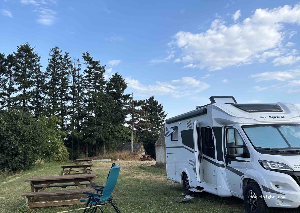 Très bon accueil et vue magnifique. visite de la ferme très intéressante. toilettes très propre. vidange cassettes WC. eau si besoin. au calme sur de l'herbe