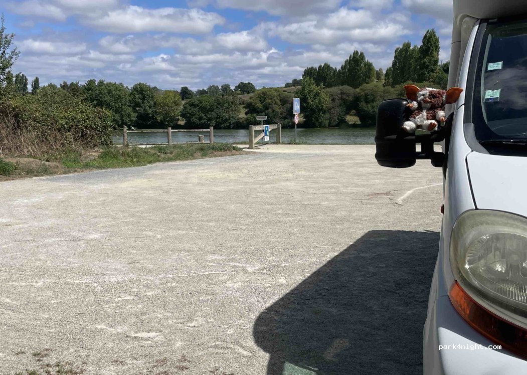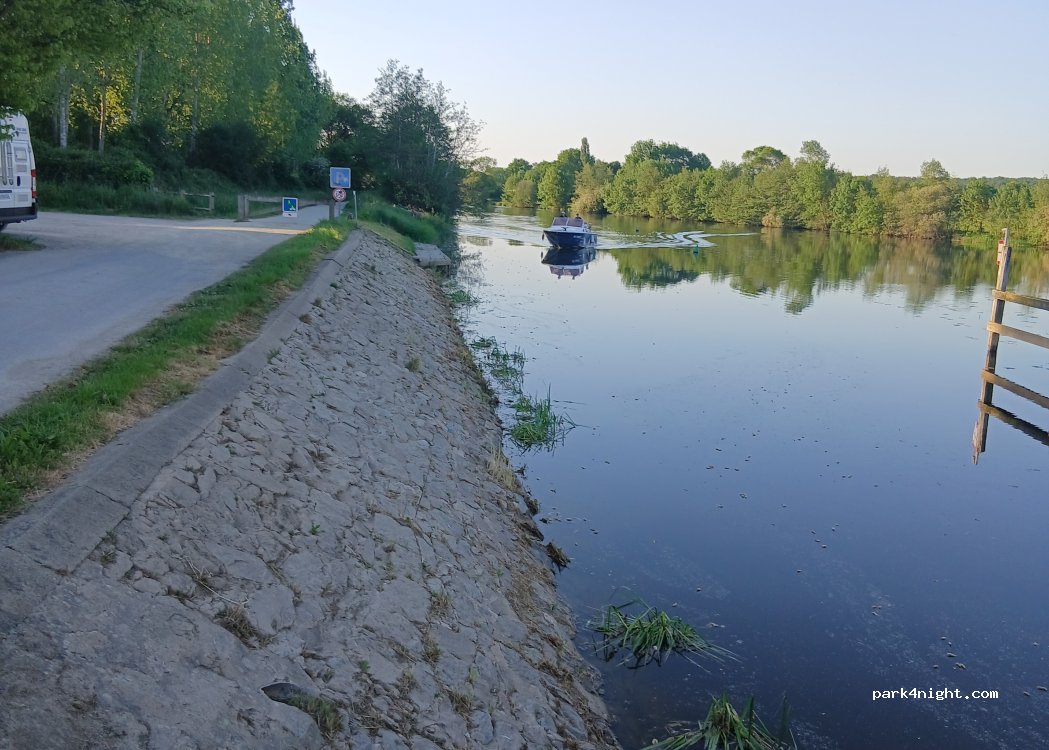 Beautiful, quiet small parking area. Please respect limited space so only for smaller camper cars. Lovely walk of 5k to Chateau Gontier and opposite direction 2k to Menil with nice bar, along riverside path. Excellent calm night.