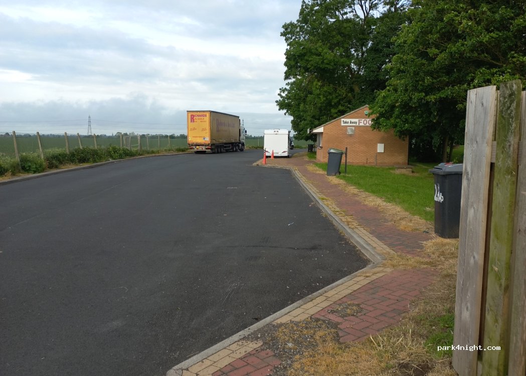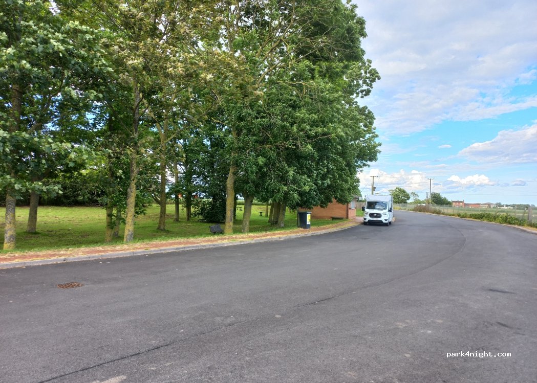 Nice flat tarmac layby set of road. some road noise from lorries during night. A few other vans about. Lots of bins and grass wooded area for walking dogs also picnic benches. There is a little cafe but not open on our visit
