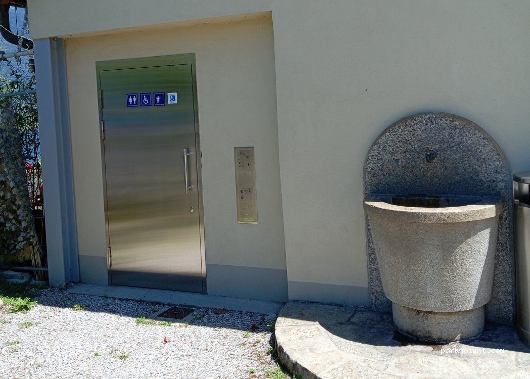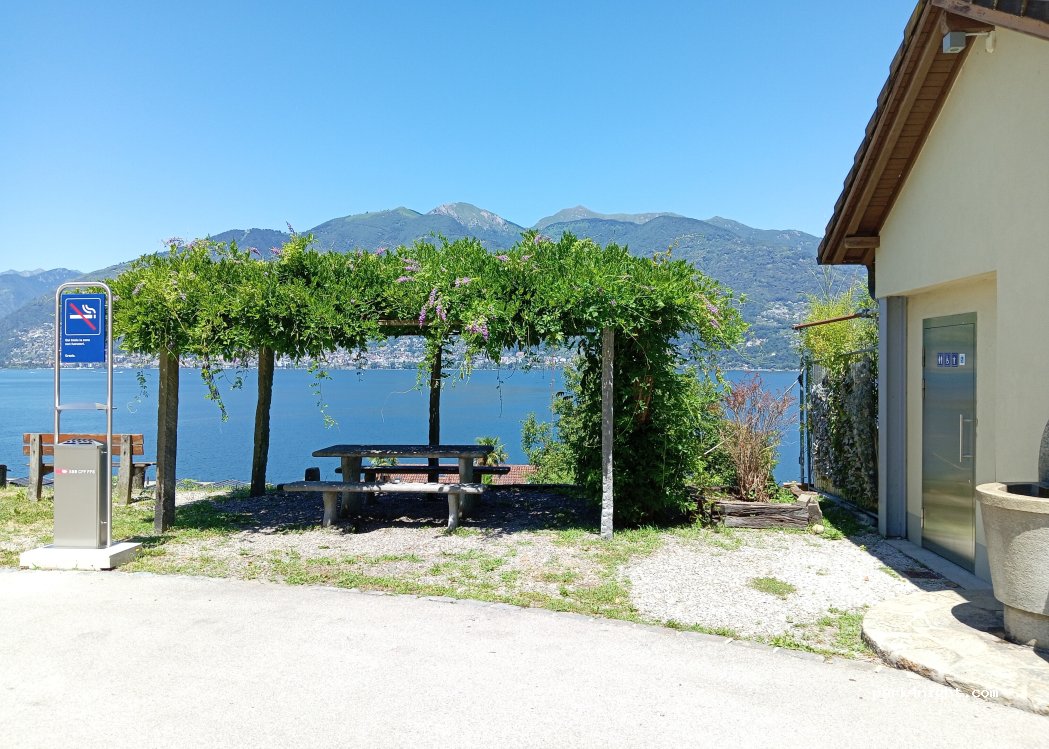 À la gare, toilettes 1CH. Robinet à côté. Table ombragée avec jolie vue sur le lac.