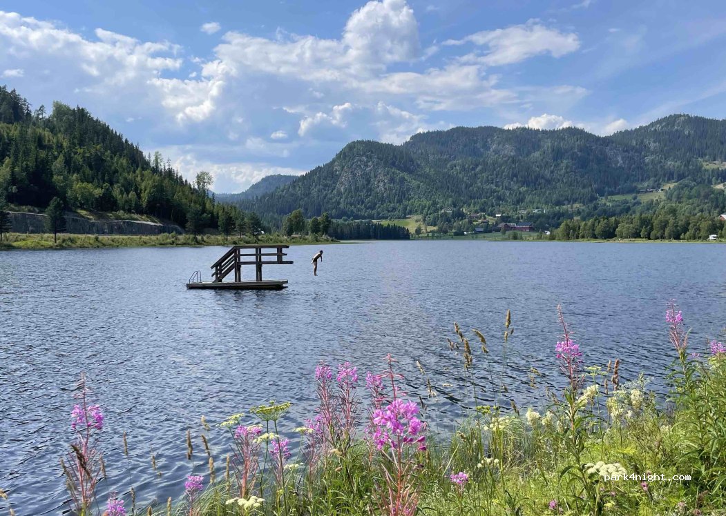 Ein schöner Zwischenstopp mit Bademöglichkeit und Picknicktisch. Es gibt eine Rasenfläche, einen kleinen Strand und ein Sprungbrett in den See. Parkplätze für ca. 15 Autos.