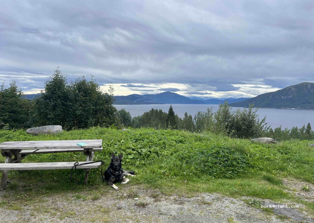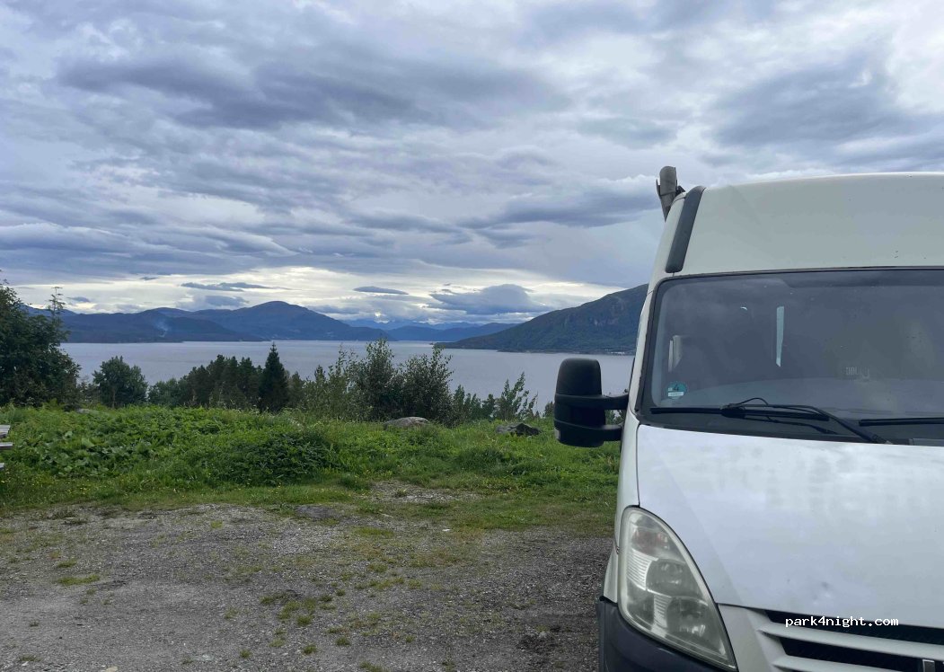 A 5 mn du ferry ce spot offre une vue sur un paysage magique. Fjord aux pieds et une ceinture de montagnes enneigées apparaissant derrière de fins nuages. 2 places maxi pour fourgons ou vans. Terrain à peu près plat mais semblant spongieux par endroit. Equipement: 1 table de pique nique. Pas d'autres services. On est assez proche de la route mais pratiquement aucun passage.
