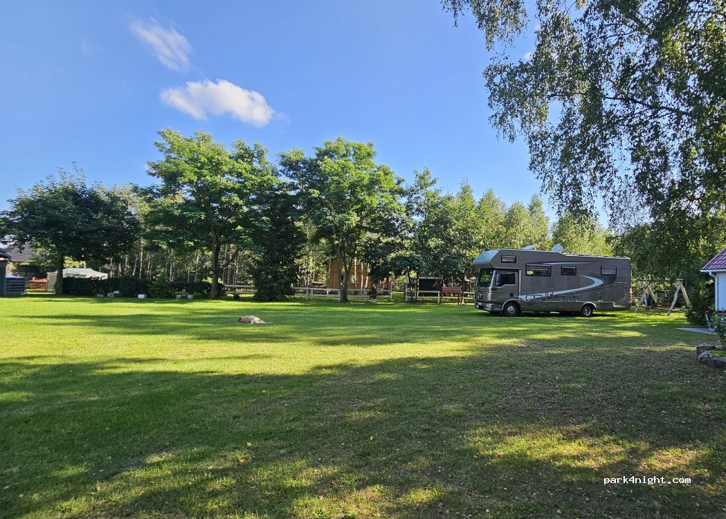Camping, Pitch & Accommodation U. Gadomskich. A very well-maintained, beautiful, and quiet spot in a wooded area. Also suitable for large motorhomes, thanks to the hard-packed meadows, even in the rain. Very friendly owners. Wi-Fi available. Short gravel road, first small path on the right, house number 105. The nearest village is Rzekun or Laskowiec on route 61.