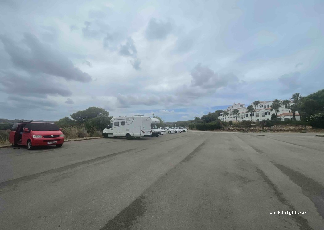 Aparcament gran, d'asfalt, ben nivellat, sense limitació d'altura, sense serveis. Diverses ac pernoctant, nit tranquila. Ideal per visitar Playas de Fornells i Cala Tirant.