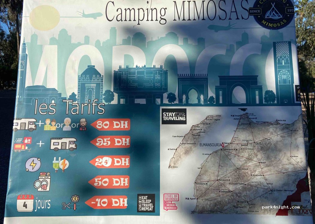 Deuxième fois pour nous dans ce camping. Nous avons payé 100 dirham par nuit avec l’électricité. Les tarifs sont affichés a l entrée 80 MAD l emplacement 95 pour les véhicules avec remorque. 20 dirham pour l électricité. Il y a une douzaine de places pour les gros véhicules. Et plus encore pour les autres véhicules il existe deux blocs sanitaires. Un juste a cote des places des gros véhicules qui comprend 1 douche et deux toilettes chez les hommes (idem chez les femmes). Ainsi qu’un lavabo. Il y a aussi 2 évier pour la cuisine (eau froide) et une machine a laver (marque bosch). Le deuxième bloc sanitaire est plus grand et ce trouve dans l allée centrale du camping (qui mène vers les bungalows et le café/restaurant). Dans ce bloc sanitaire 2 douches et beaucoup de toilettes + quelques éviers pour la vaisselle. Meme chose du cote des hommes. Ces douches la sont plus grandes. Dans les deux blocs sanitaires l’eau des douches était bien chaude meme si parfois elle pouvait devenir assez fraîche. Cela restait agréable (il suffît d être un peu patient l eau chaude revient vite). Le personnel est très réactif: un des robinets de l évier du bloc 1 fuyait fort, il a été répare dans la journée. Si vous souhaitez goûter aux tajines, demandez a l accueil ils vous indiqueront où se trouve le café/restaurant. Nous y avons commandé un tajine pour 3 personnes poulet/ légume a 17h, prêt pour 19h30. 90MAD servi avec du pain. Une grosse cuisse de poulet +2 morceaux d’une partie non identifiable. Suffisant pour nous (2 adultes et 1 enfant). Très bon! Seul bémol le bruit: vous êtes en ville donc on entend la rue, le chien de l entrée qui joue son rôle en aboyant pour chasser les chiens errants , le coq qui chante parfois a 5h du matin (mais ça ne nous dérange pas trop car nous en avons un chez nous donc nous avons l’habitude). Il y a une jolie basse cour qui se promène dont des paons et beaucoup de gentils chats. Le petit hic c est que soit eux soit notre chat ont aspergé les marches de l entrée du camping car. Nous ne savons pas si c est notre chat qui a voulu marquer son territoire en mode « défense d’entrer » pour les autres ou bien les chats du camping. L’odeur étant forte prévoyez peut être d asperger un peu de vinaigre sur vos pneus et marches pour éviter que cela ne se produise. A voir si les autres campings caristes ont eu ce soucis ou si c’est a cause de notre chat ??♀️. Bref une bonne adresse et nous reviendrons, nous aimons la douceur de vivre et la gentillesse du personnel. Aussi nous avons eu besoin d’emmener notre fils chez le médecin et le gardien nous a indiqué comment nous rendre a la clinique Mimosa où il a été reçu par une doctoresse très douce, très pédagogue et compétente. Milles merci ??