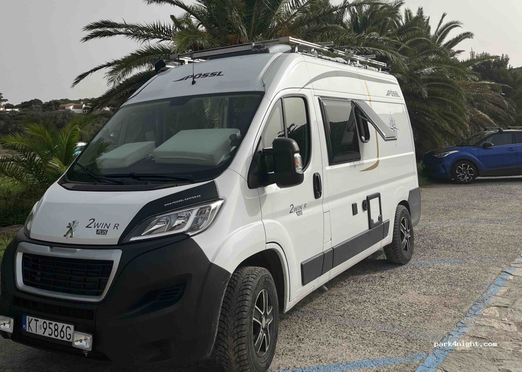 Sehr ruhiger großer Parkplatz , momentan noch nichts los und kostenlos. Polizei kommt und kontrolliert - also Leute keine Stühle und Tische raus oder es kostet :) Haltet euch vor dem Durchfahrtsverbotschild. Strandbar und Restaurant in der Nähe und jetzt schon geöffnet, schöne kleine Bucht. Hab mich sehr sicher gefühlt , sehr ruhig ☀️