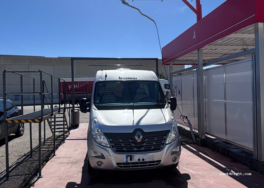 Gasolinera CEPSA y de bajo costo con área de lavado para autocaravanas de hasta aproximadamente 7 metros de largo. El acceso es mediante escalera para la limpieza del techo (paneles solares, etc.) de nuestras autocaravanas y caravanas. Muy conveniente, con amplio espacio para maniobrar vehículos grandes. Acceso rápido a las autopistas V-31 y AP-7.