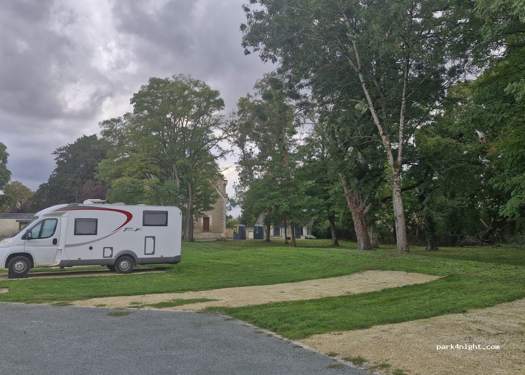 Aire municipale. Vidange eau grise, remplissage eau claire et même électricité gratuits . Au moins 15 places. Devant le vénérable château de la commune. Calme sauf les oiseaux ;-) Merci à la municipalité !