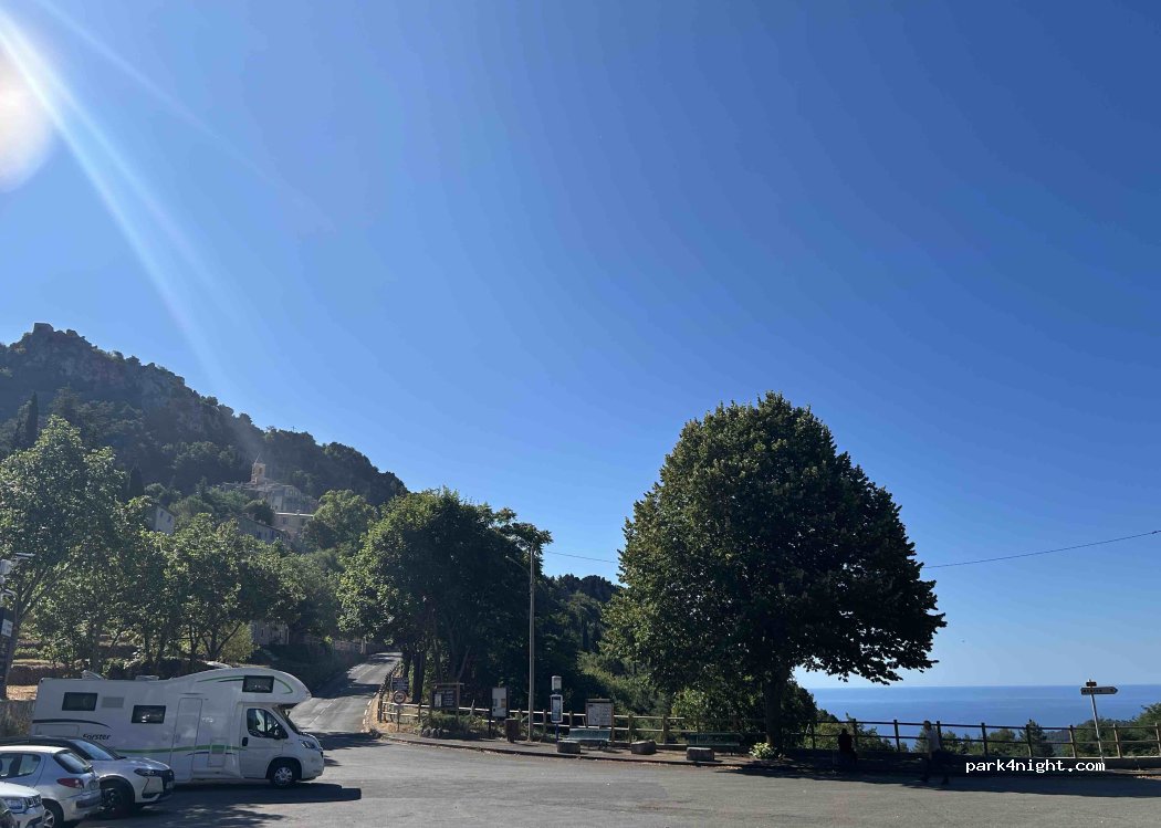 Un coin hyper sympa, le village est magnifique avec une vue exceptionnelle, nous sommes montés par la route qui vient de la sortie de l'autoroute, très flippant avec un camping-car capucine de 7 m. Arrivés en bas du village, nous avons été inquiétés par un panneau interdit aux camping-cars, mais c'est adressé à ceux qui voudraient continuer la montée, au croisement en bas du village pas de souci pour passer la nuit. Réveillé le matin par des employés municipaux qui bavardaient à côté, très sympa et sans reproche sur le fait que nous soyons garés là.