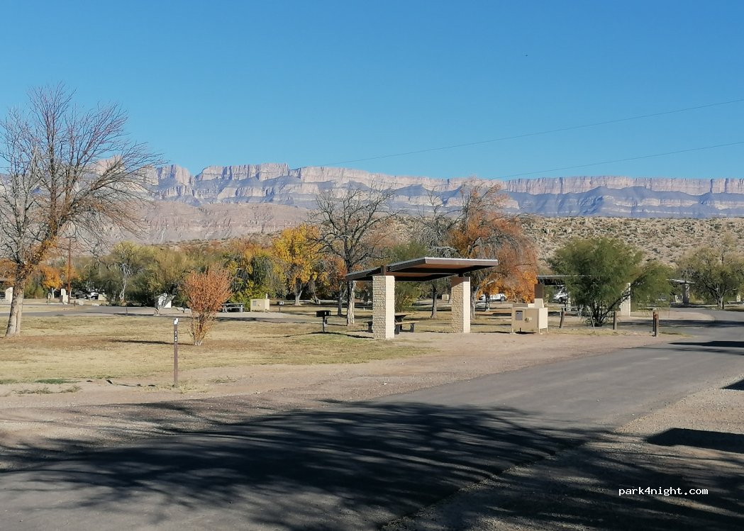 Set in a grove of cottonwoods and acacia trees, the Rio Grande Village Campground is located near the Rio Grande. Elevation: 1,850 feet. Paved roads connect each campsite, and grassy areas separate each site. Flush toilets, running water, picnic tables, grills, and some overhead shelters. Dump station nearby. Campers enjoy birdwatching, hiking, exploring. A camp store with showers and a park visitor center are nearby. Open year-round. RESERVATIONS ARE REQUIRED. No first-come first-served camping. Wood fires and ground fires are NOT allowed anywhere in Big Bend National Park. A charcoal fire in an above-ground grill is allowed; ashes must be packed out. Liquid-fuel stoves are allowed.